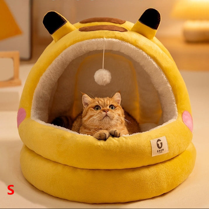 Katzenbett im gelben Comic-Design – Warmes, geschlossenes Kuschelnest für alle Jahreszeiten